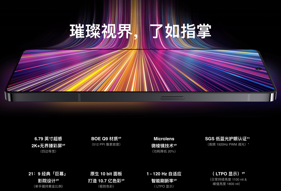 魅族20 INFINITY无界版也就是俗称的超大杯,采用6.79英寸21:9的3192*1368分辨率、1-120Hz LTPO,1920Hz PWM高频调光、峰值亮度1850nit的京东方Q9屏幕,2.48mm四边等窄屏幕,512ppi,屏占比91%;