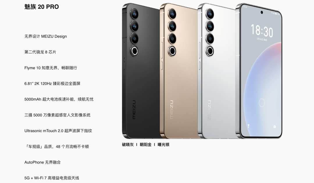 魅族20 PRO采用6.81英寸3200*1440分辨率三星2K E6 120Hz LTPO居中单挖孔OLED柔性直屏,POP封装,515ppi,局部峰值亮度1800nit,超声波屏下指纹2.0,直角金属中框+玻璃后盖,提供破晓灰、曙光银、朝阳金3个配色,机身三围164.2*76.4*厚约7.8mm,重约209g;
