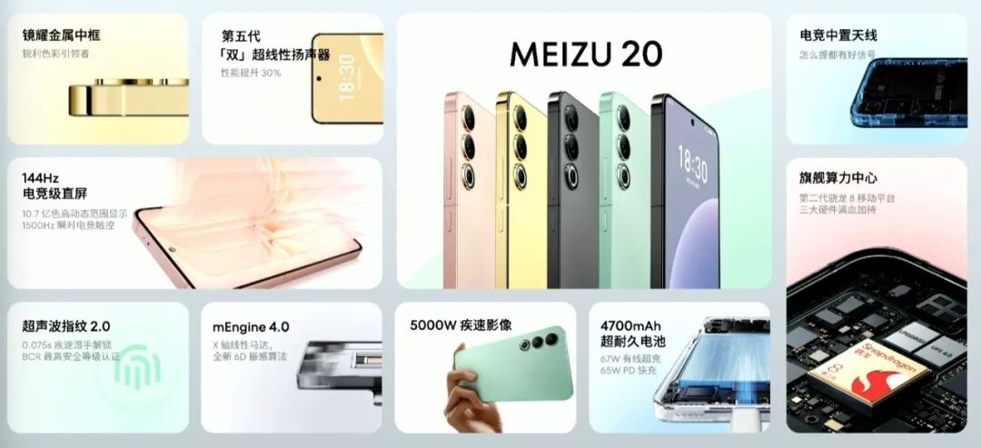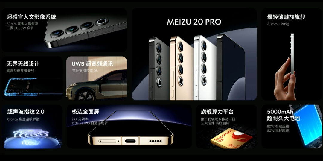 核心配置上,魅族20 PRO搭载骁龙8Gen2,LPDDR5X+UFS 4.0,5000mAh电池、80W有线充(兼容PD3.0等)、50W无线充,支持NFC、红外遥控、双·超线性扬声器、X轴线性马达、IP54防护、USB2.0、UWB等;UWB汽车钥匙,首批支持领克08,后续将兼容更多车辆;
