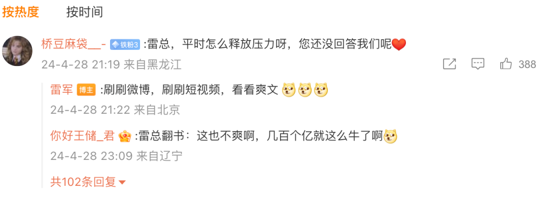 记得今年4月,雷军还曾和网友互动时表示平时释放压力会:“刷刷微博,刷刷短视频,看看爽文。” 问问大家,你平常看爽文和短剧吗?为什么喜欢看?