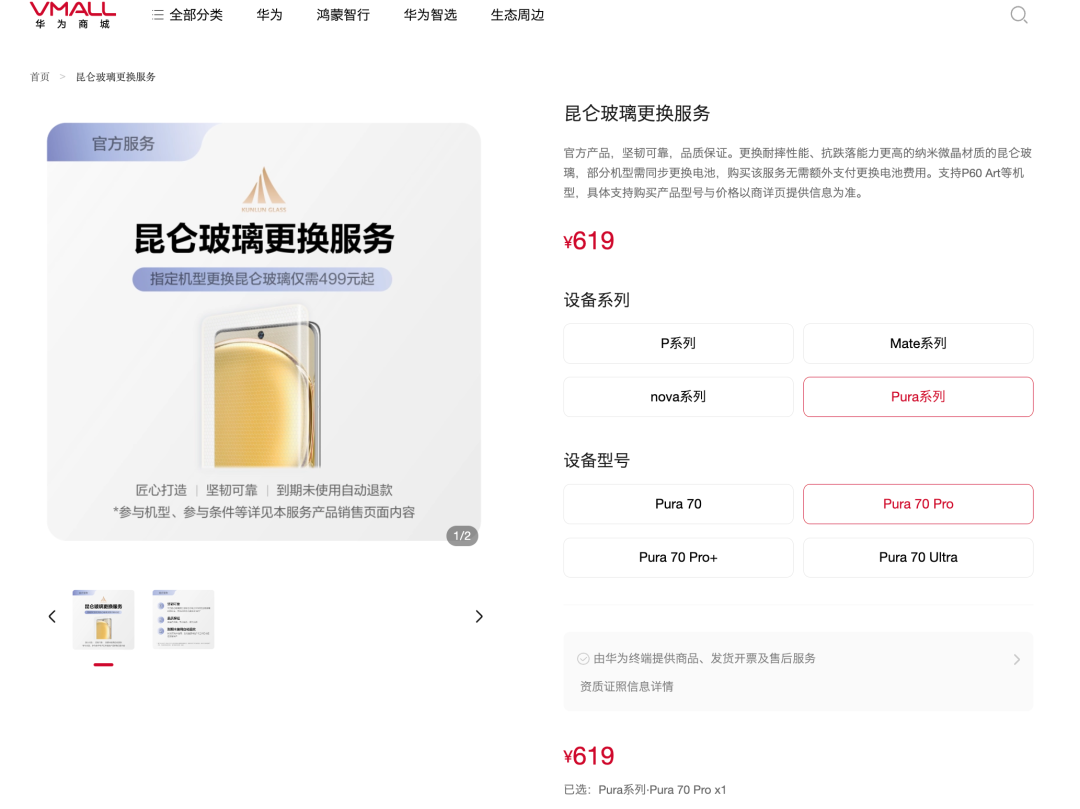 作为补充,此前华为在发布Pura 70系列时,曾介绍称Pura 70、Pura 70 Pro屏幕盖板为第二代昆仑玻璃,华为Pura 70 Pro+和Pura 70 Ultra则为玄武钢化昆仑玻璃,由于型号、屏幕尺寸、盖板类型等存在差异,这四款机型若出现屏幕破裂需要更换昆仑玻璃的话,价格也是不同的。