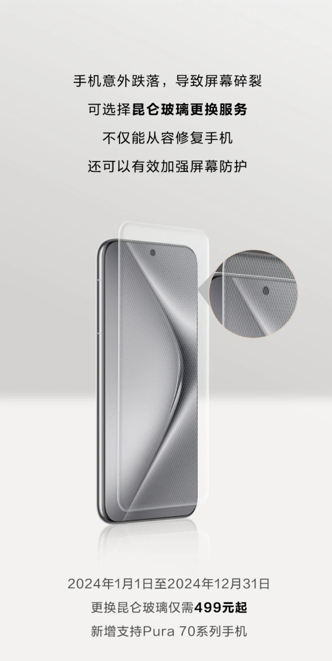 官方表示如果用户的手机意外跌落导致屏幕碎裂,可选择昆仑玻璃更换服务,不仅能从容修复手机,还可以有效加强屏幕保护,2024年1月1日-2024年12月31日期间,更换昆仑玻璃499元起。