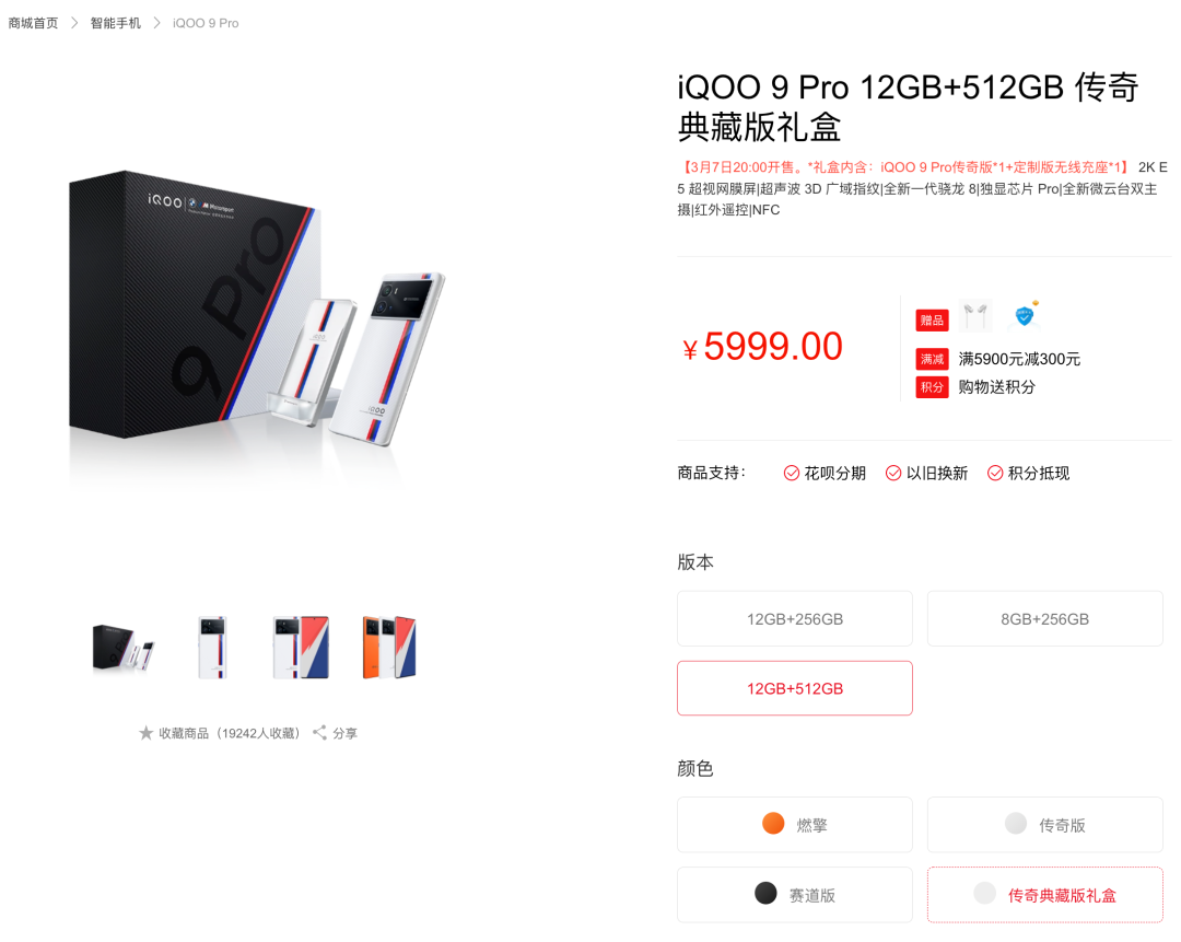如上图所见,iQOO 9 Pro 12+512GB传奇典藏版礼盒售价5999元,将于今晚20点开卖,礼盒内含一台iQOO 9 Pro传奇版外,还赠送一个价值329元的特别定制版50W无线充电底座(和传奇版一样的设计元素~)