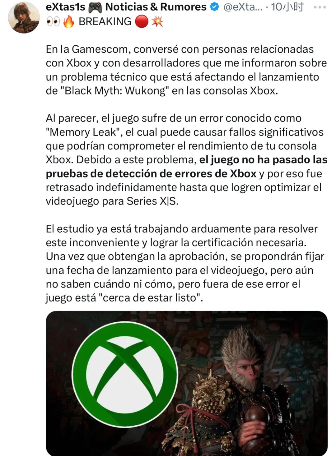 游戏博主eXtas1s透露,他在Gamescom期间与开发人员以及Xbox工作人员交流中得知,《黑神话:悟空》的Xbox版存在严重的“内存泄漏”问题,导致游戏频繁崩溃。为了解决这个问题,游戏科学团队正在对游戏进行优化,这使得Xbox版的发布日期被“无限期推迟”。除了这一关键问题之外,据称《黑神话:悟空》的 Xbox 版本已经“接近完成”,一旦内存泄漏问题得到解决,游戏的发售日期就会公布。所以Xbox玩家再耐心等等。