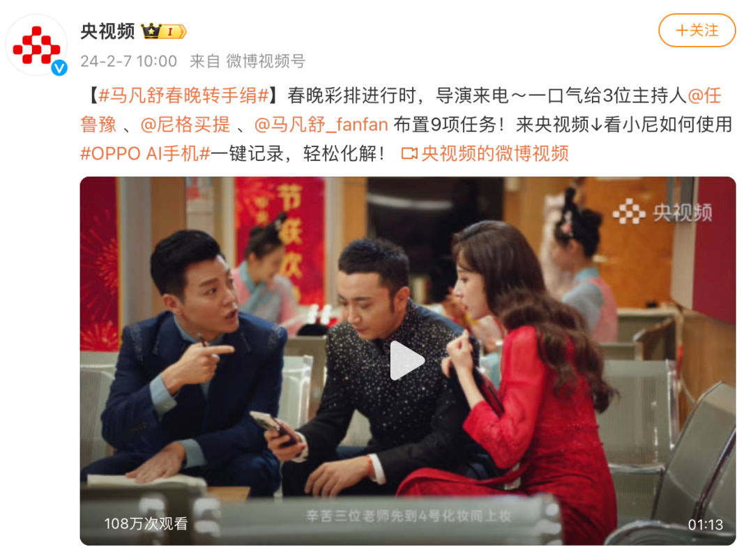 在前几天央视频更新的春晚彩排视频中,还看到了OPPO的植入,主持人演示了Find X7 Ultra的AIGC消除功能、AI智能通话摘要功能。