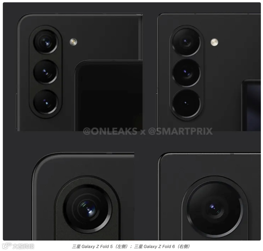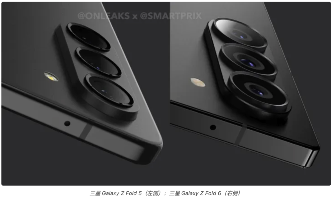 首先是三星Galaxy Z Fold6,Onleaks分享的渲染图显示Z Fold6机身将更加方正,相机模组也比上代Z Fold5大了一点点、同时凸起更明显,早前爆料三星还计划为Galaxy Z Fold 6配备与S24 Ultra相同的主摄:200MP,1/1.3英寸传感器,f/1.7光圈、AF和OIS,但也有爆料称继续维持50MP,目前两种说法各持一词。
