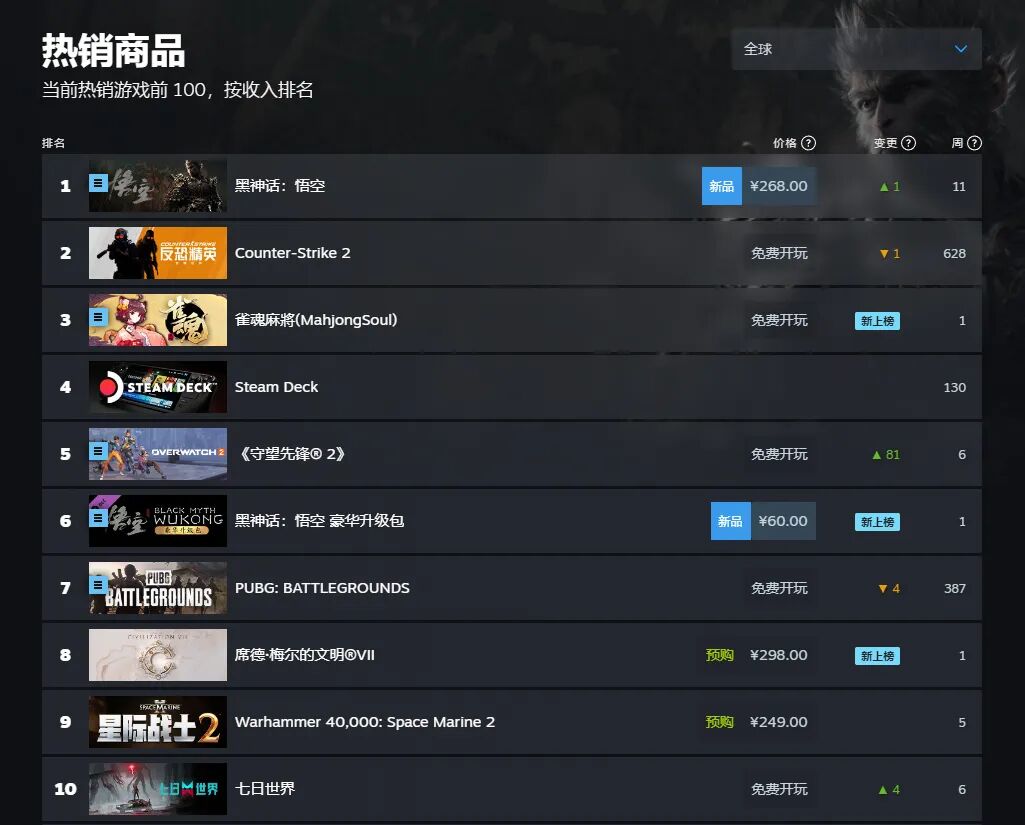 据了解,《黑神话:悟空》首发日在Steam达成了2,223,179人同时在线的成就,仅次于《绝地求生》(2018年,3,257,248人),今天下午15点左右查看时,该游戏在Steam所有国家和地区热销商品榜单中均位列第一位。