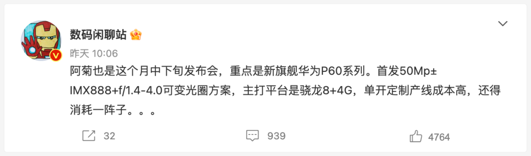 据爆料华为P60系列将于本月中下旬发布,将首发50MP±索尼IMX888+F/1.4-4.0可变光圈方案,主打平台是骁龙8+ 4G。另据据有关人士称,华为P60已开始量产。目前华为P60获经销商大量预订。看看这次P60系列影像表现如何~