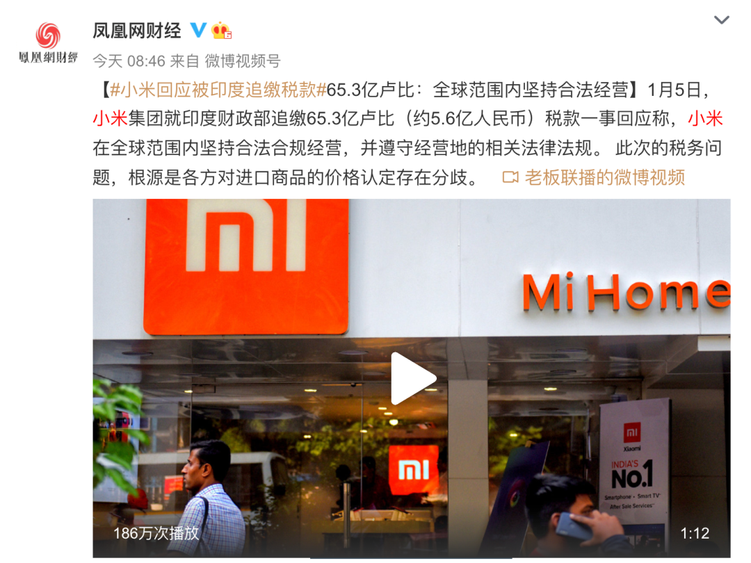 对此,小米集团就印度财政部追缴65.3亿卢比(约5.6亿人民币)税款一事