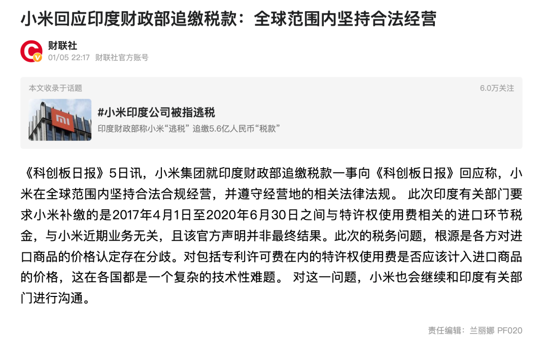 小米还表示,此次印度有关部门要求小米补缴的是2017年4月1日至2020年6月30日之间与特许权使用费相关的进口环节税金,与小米近期业务无关,且该官方声明并非最终结果。此次的税务问题,根源是各方对进口商品的价格认定存在分歧。对包括专利许可费在内的特许权使用费是否应该计入进口商品的价格,这在各国都是一个复杂的技术性难题。对这一问题,小米也会继续和印度有关部门进行沟通。