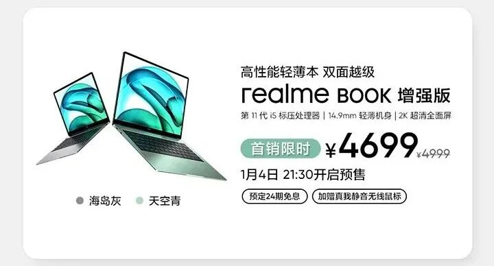 如上图所见,realme Book增强版官方称4大升级:①设计升级 天青色配色;②性能越级 CPU多核提升21.8%,GPU提升68%;③散热升级 首发超强VC液冷散热,散热提升32.7%;④内存升级 16+512G超大内存,首销4699元起,目前已经开启预售,将于1月7日0点正式开售。