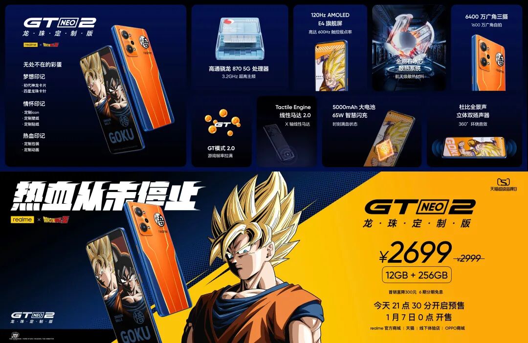 而「realme真我GT Neo2龙珠定制版」,据官方介绍,其是realme首个深度定制产品①机身设计:机甲元素,背面悟字经典战袍设计;②包装、配件深度定制(四星龙珠·卡针、神龙卡片等),附赠有丰富的人物贴纸;③深度定制个性主题,还有GT模式动画;。