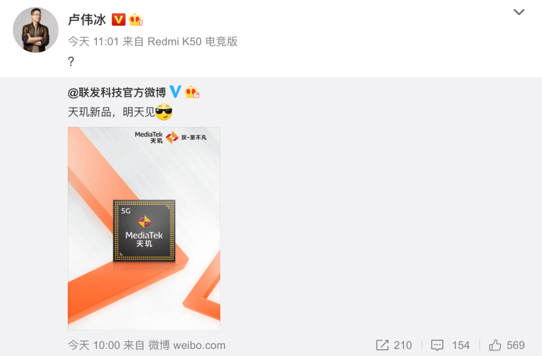 对了,今天联发科官宣新SoC即将到来后,卢伟冰还转发互动了一个「?」,有网友调侃卢总这是想调侃“背着我发新芯片”?大家图个乐吧~