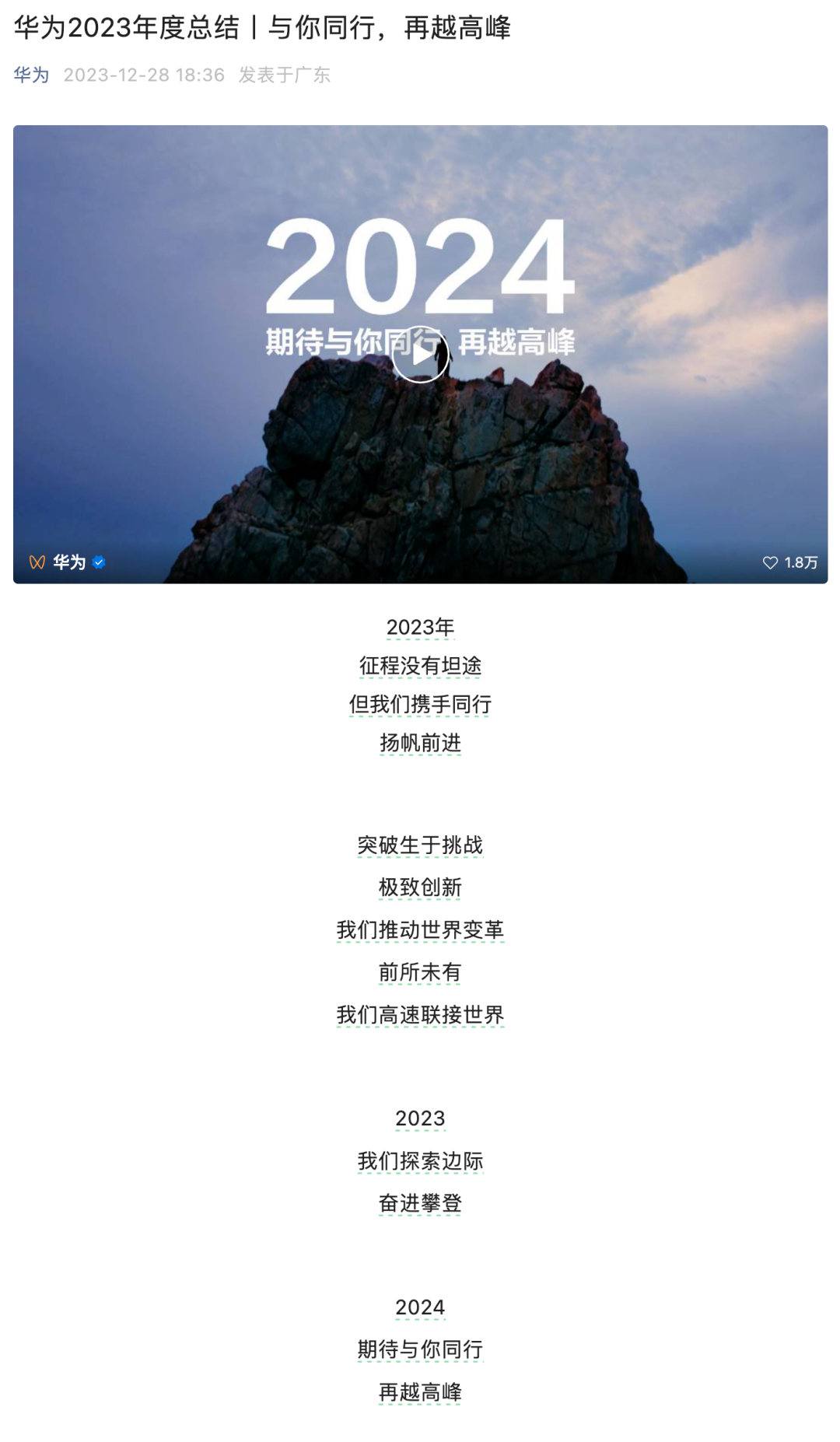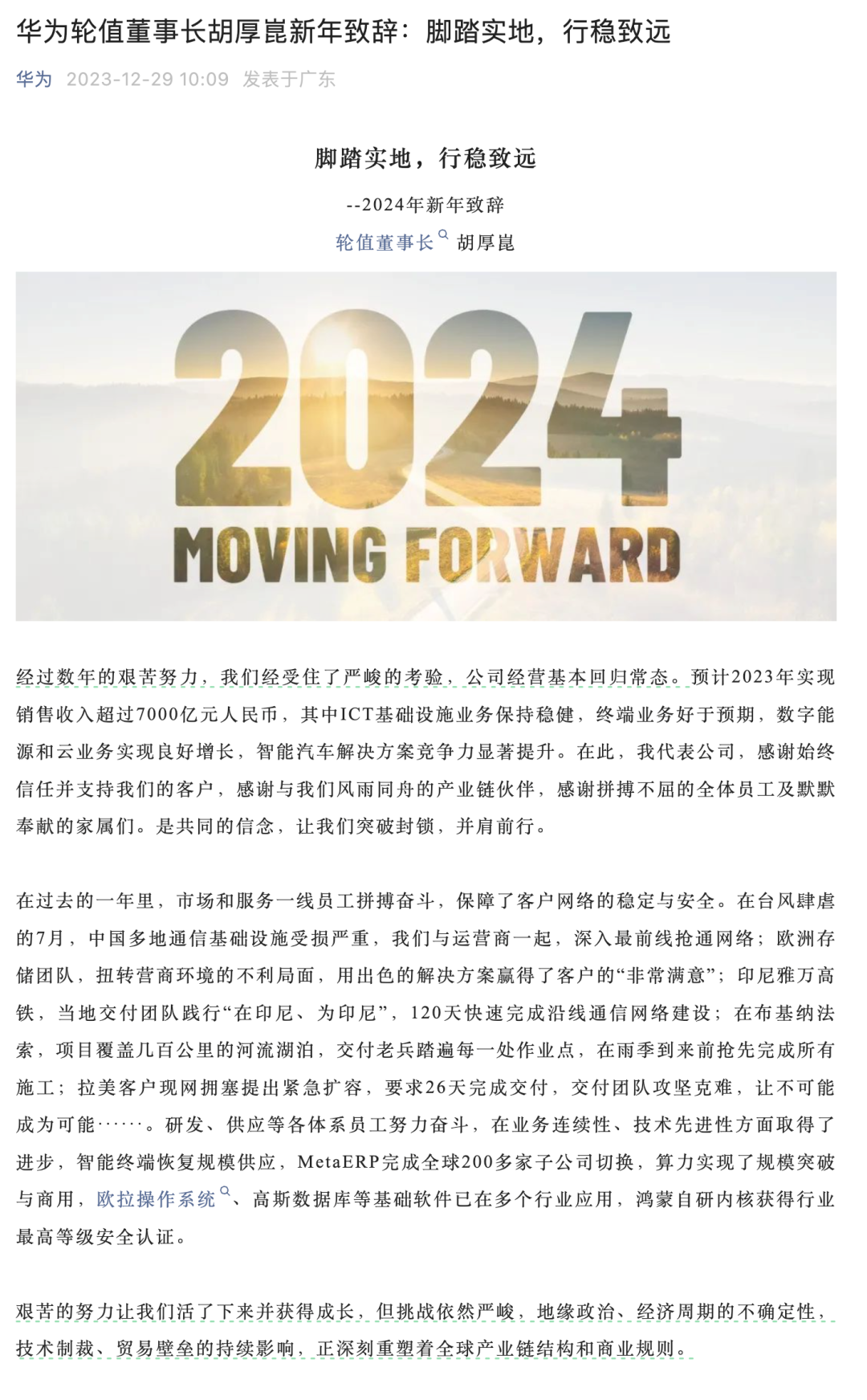 如上图所见,华为轮值董事长胡厚崑在华为官方账号发表了新年致辞。致辞中其提到“经过数年的艰苦努力,经受住了严峻的考验,公司经营基本回归常态。预计2023年实现销售收入超过7000亿元人民币,其中ICT基础设施业务保持稳健,终端业务好于预期,数字能源和云业务实现良好增长,智能汽车解决方案竞争力显著提升。”