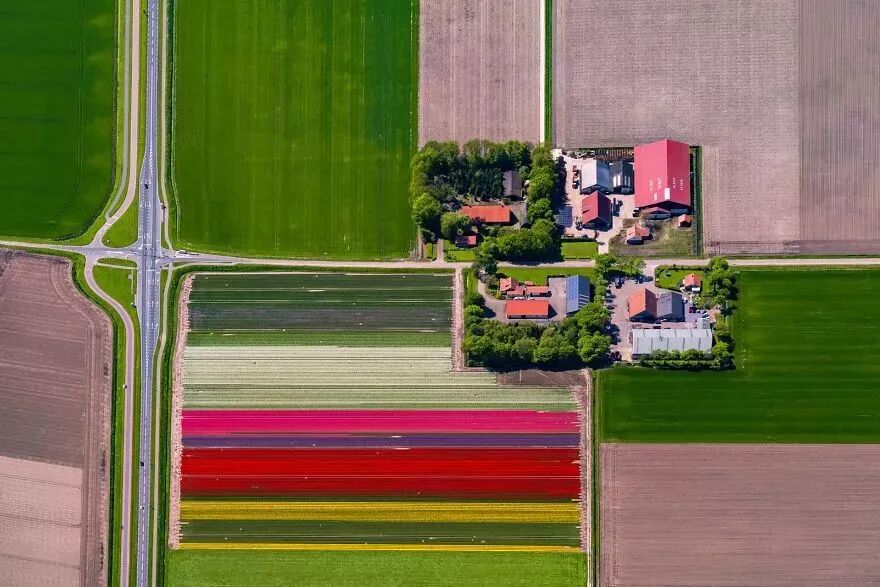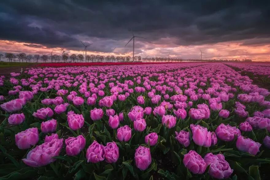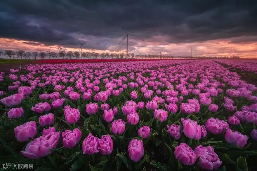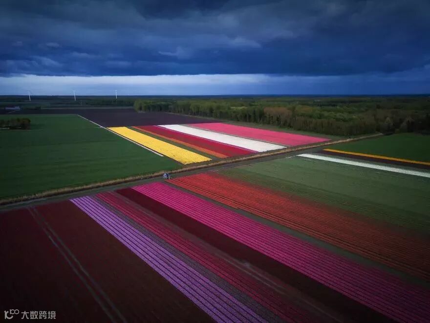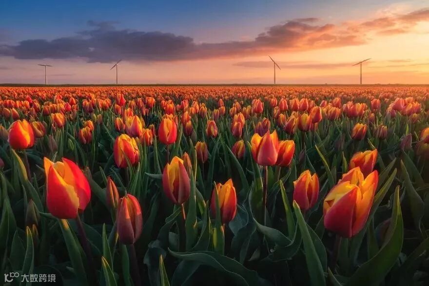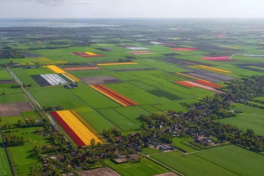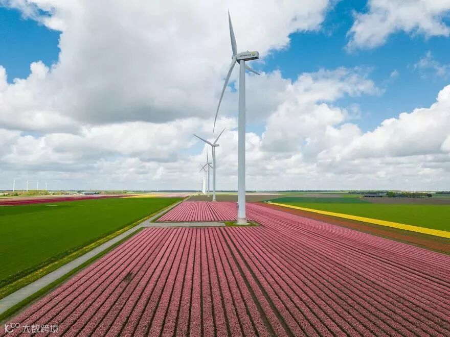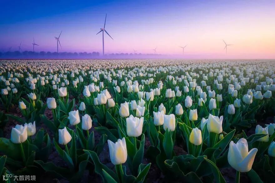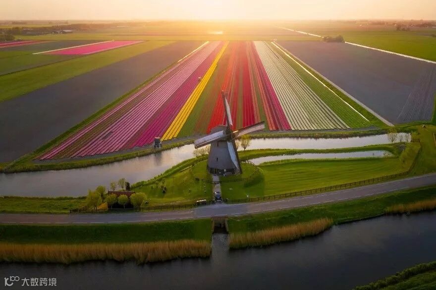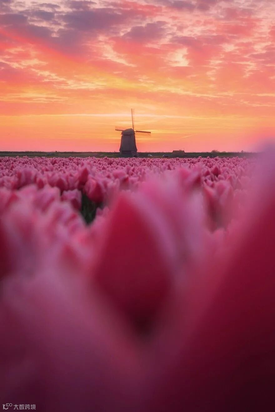 这里不仅风景优美,还拥有3500公顷荷兰最大的球根花田。一望无际的郁金香花田和高高矗立的风力发电机组成了一幅绵延100公里的美丽画卷。