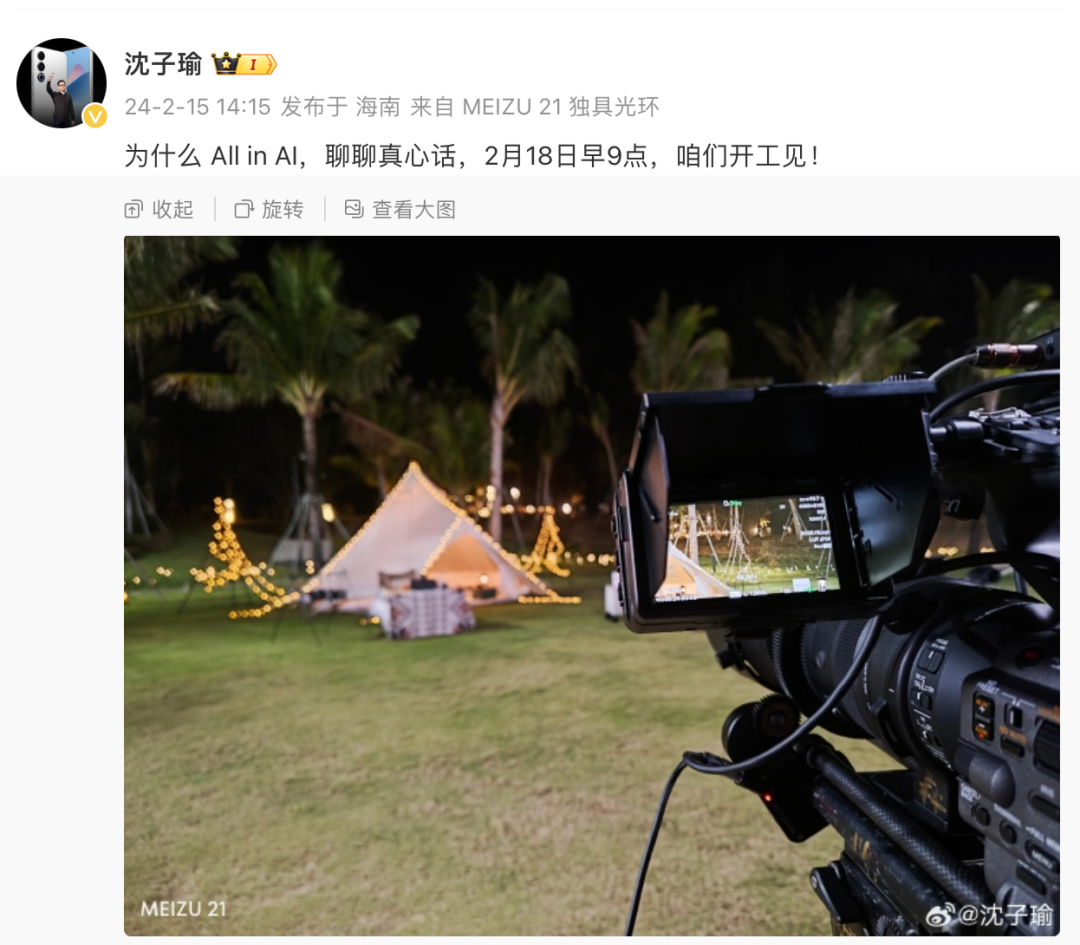 如上图所见,星纪魅族CEO沈子瑜今日发文:“为什么 All in AI,聊聊真心话,2月18日早9点,咱们开工见!”