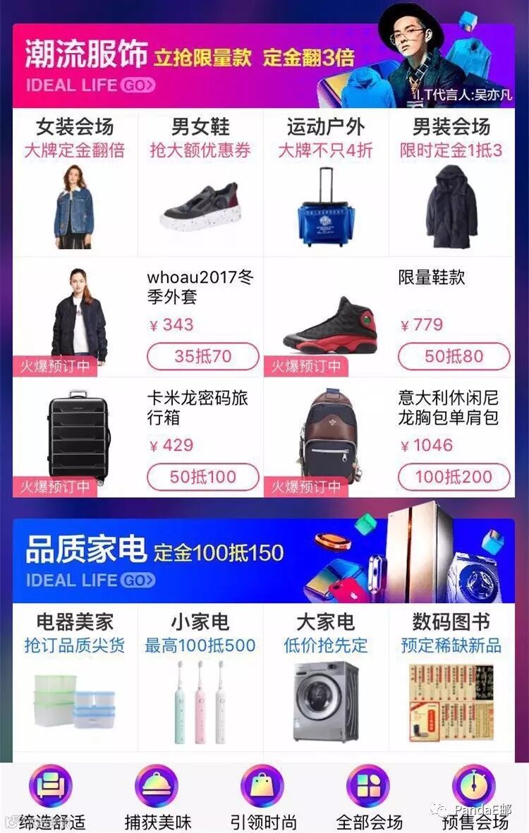 天猫的不同商品及商家,分为19个分会场,涵盖:女装、男装、女鞋男鞋、美妆洗护、运动户外、箱包、内衣配件、珠宝宠物、母婴用品、童装玩具、手机数码、家电、家具、家装、百货、美食、汽车配件、游戏、全球购。