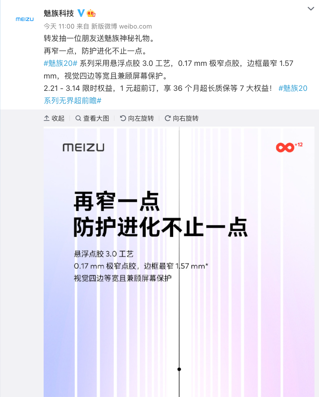 另外是魅族20系列,今天更新了一张预热海报:悬浮点胶3.0工艺,边框最窄 1.57mm,视觉四边等宽。