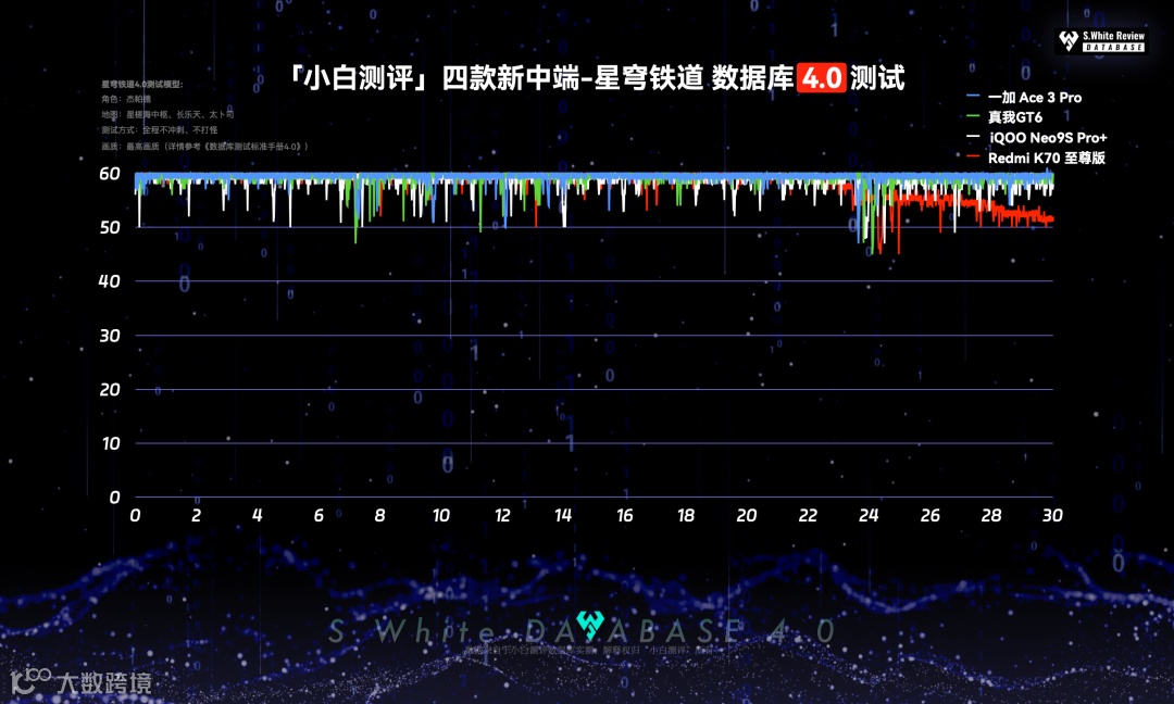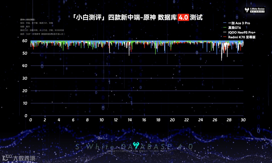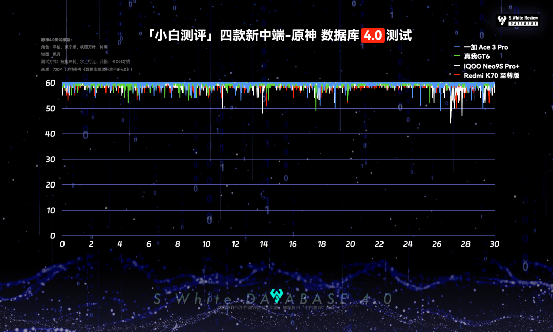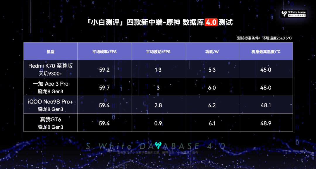 《原神》方面,实测一加Ace3 Pro帧率最高,为59.7帧,功耗6.0W,机身最高温度48℃。iQOO Neo9S Pro+和真我GT6虽然帧率相同,但后者机身温度更高。