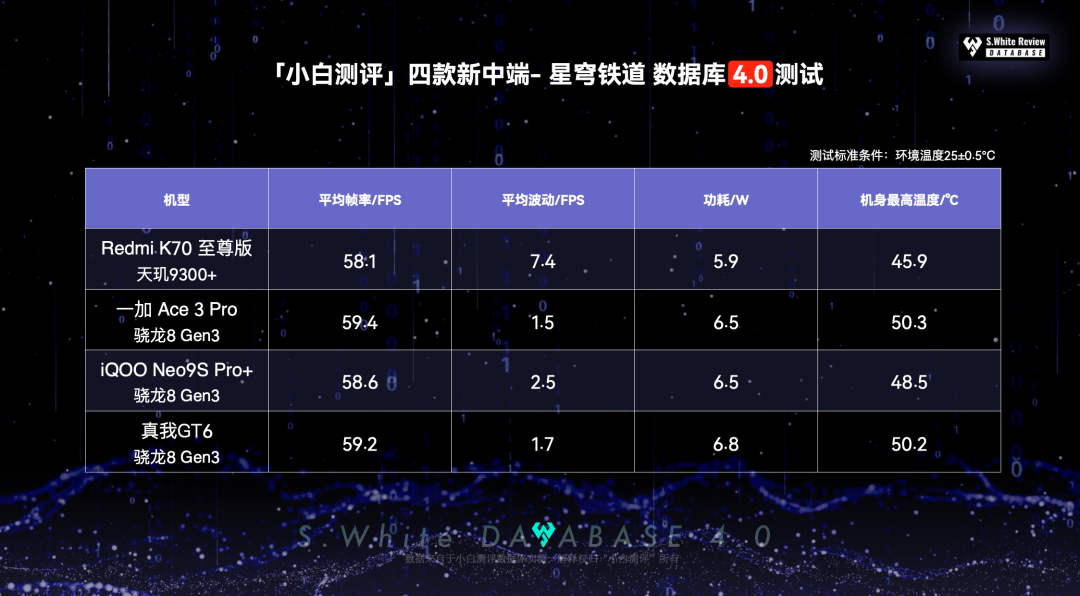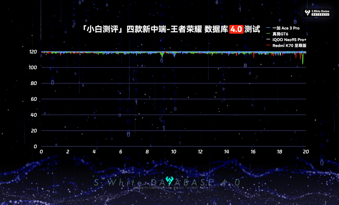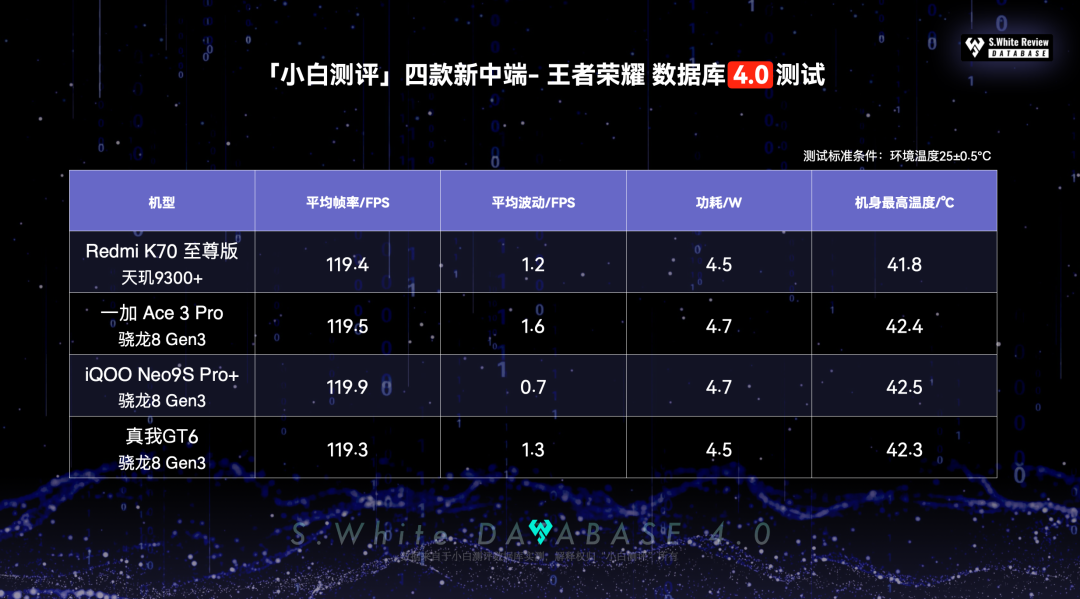 数据库4.0模型下实测《王者荣耀》,4台中端新机帧率差不多,最高的是iQOO Neo9S Pro+(119.9帧),功耗4.7W,机身最高温度42.5℃。