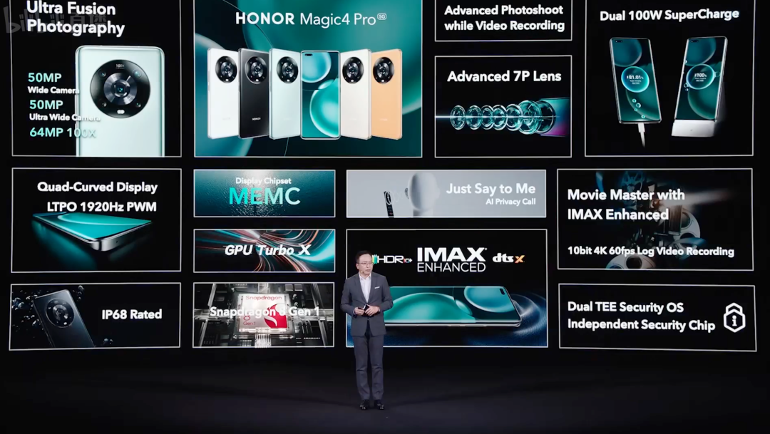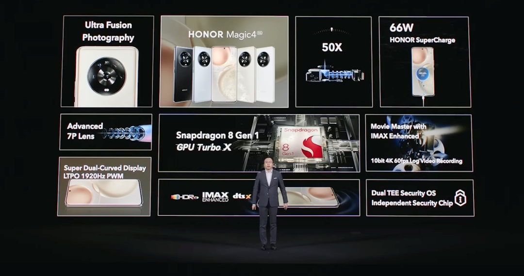 核心配置上,Magic4搭载骁龙8 Gen1处理器,支持双模5G,4800mAh电池,66W有线充电,不支持无线充电;前置12MP超广角(无3D人脸),后置三摄50MP广角主摄 IMX766➕50MP超广角➕8MP潜望长焦(有ois 5X光变 最高50X数码变焦);IP54防尘防水,内置MagicUI 6.0等。