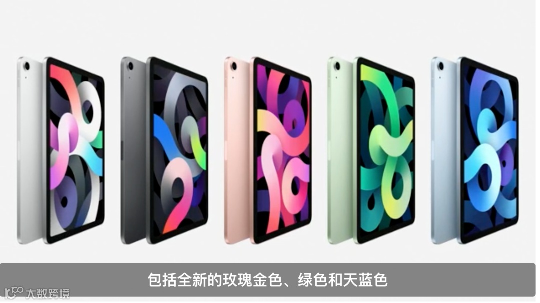 上图是2020年9月发布的iPad Air 4,采用10.9英寸2360*1640分辨率的全贴合屏,提供银色、深空灰、玫瑰金、绿色、天蓝5个配色,顶部按键电源键集成Touch ID,没有Face ID没有120Hz,没有激光雷达扫描仪,前置7MP,后置iPad Pro同款12MP等。