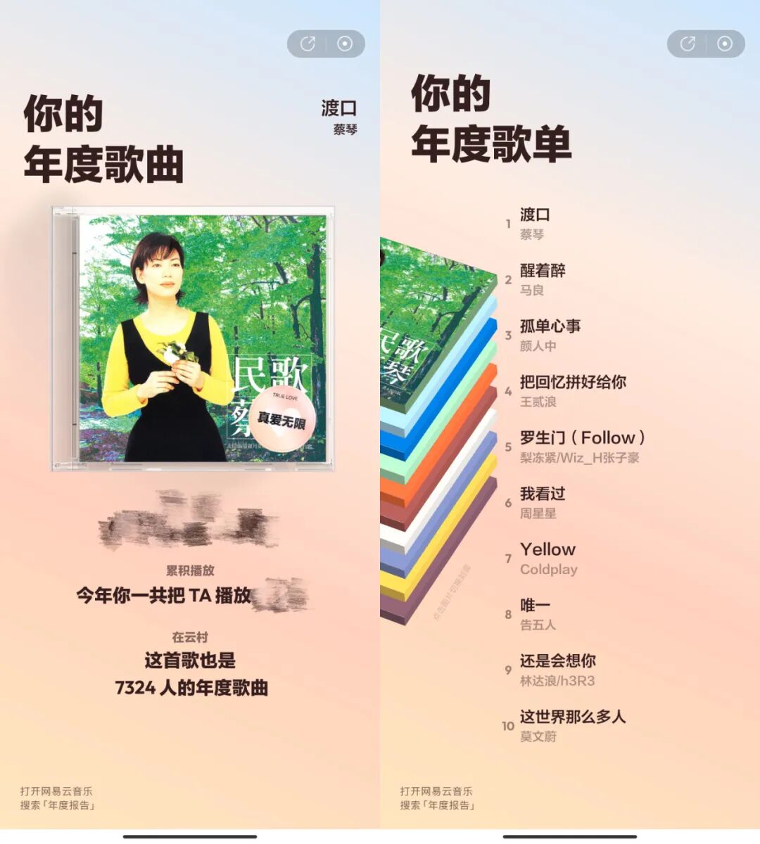 我们有一位负责测试的小伙伴网易云音乐年度歌曲是蔡琴的《渡口》,如果你经常看小白测评的视频应该很熟悉~大家现在最常用的听歌平台都是哪个App?