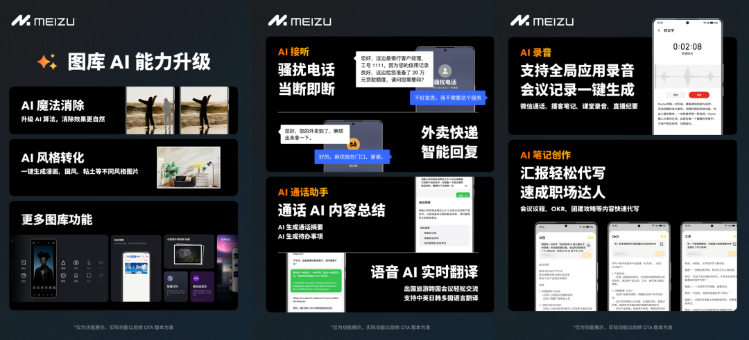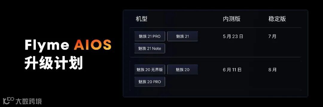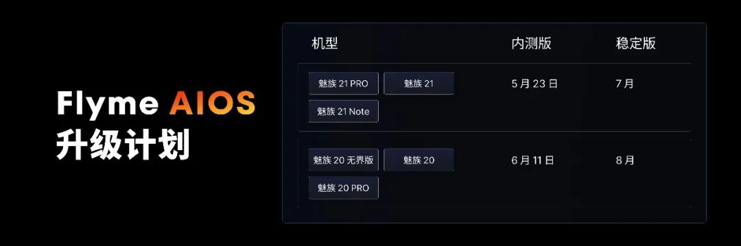 不过提醒大家注意的是,魅族Flyme AIOS这些新功能宣传海报均有小字标注“仅为功能展示,实际功能以后续OTA版本为准”。具体机型更新时间表见配图,魅族21系列将于5.23开启内测,预计7月推送稳定版;魅族20系列6.11开启内测,8月推送稳定版。具体不同功能上线时间也有些许差别。魅族用户记得关注相应的时间。