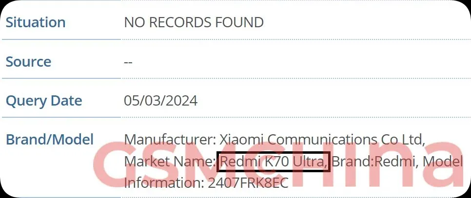 如上图所见,小米型号为2407FRK8EC的5G新机于5月13日获得3C认证,配备120W充电器,消息称这款新机正是Redmi K70至尊版。