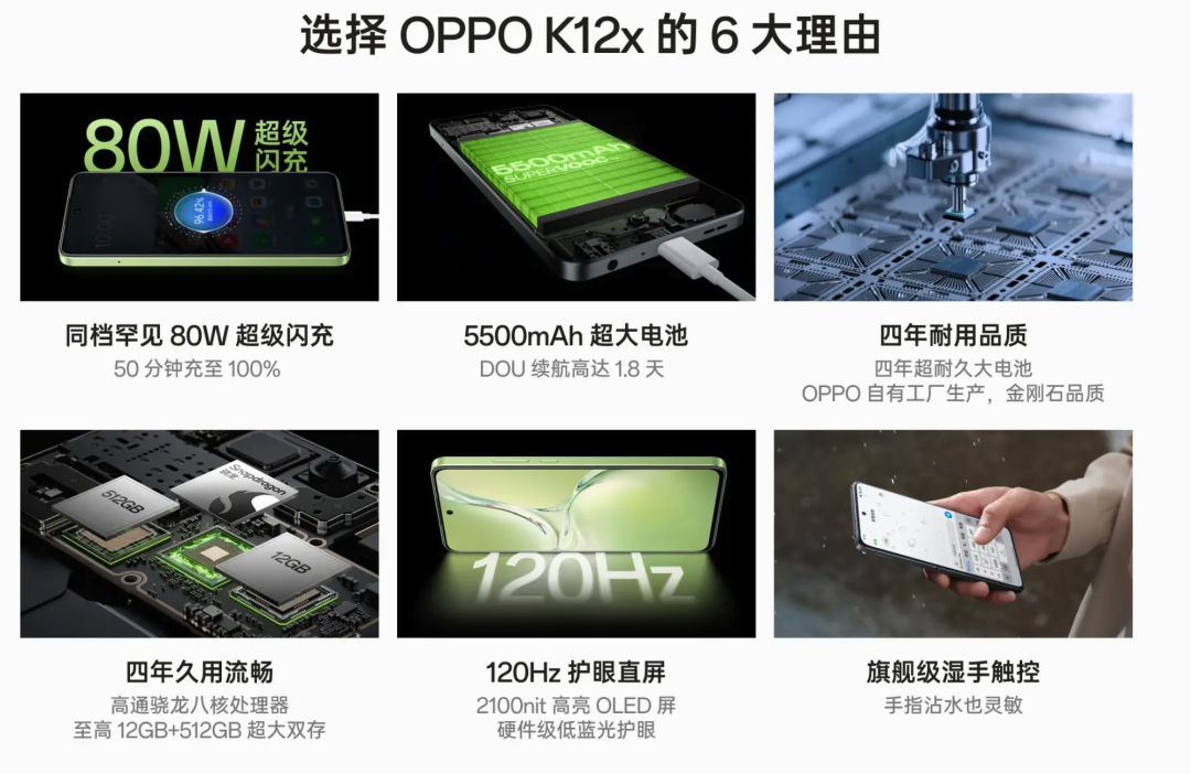 官网显示OPPO K12x主要配置为:6.67英寸2400*1080分辨率的OLED直屏,120Hz刷新率,394ppi,屏幕指纹,机身三围162.9*75.6*厚约8.1mm,重约191g,保留3.5mm耳机孔,不支持NFC,立体双扬,单频GPS;前置16MP,后置双摄50MP+2MP,搭载骁龙695处理器,LPDDR4x、UFS 2.2,5500mAh电池,80W有线充电,主打超长续航,首销送四年电池保。