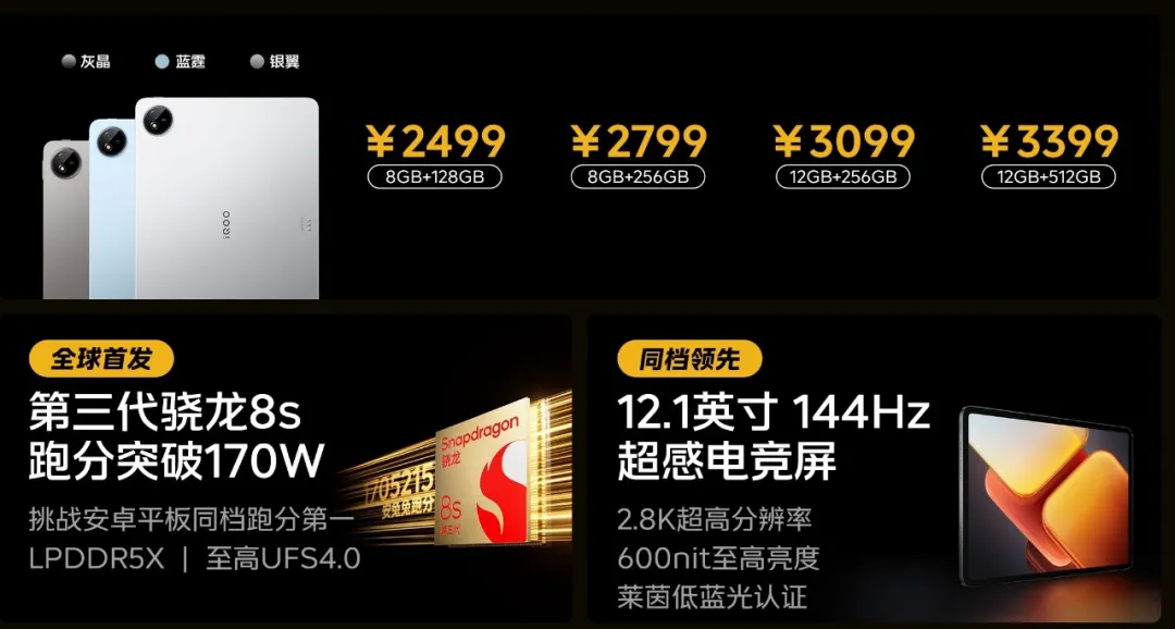 作为参考,iQOO Pad 2采用12.1英寸的2.8K 144Hz显示屏,配备10000mAh电池,44W充电,支持自研渲染超分、Monster+模式及游戏光追,8+128GB版售价2499元,8+256GB版2799元,12+256GB版3099元,12+512GB版3399元,大家觉得vivo Pad 2价格比iQOO高还是低?