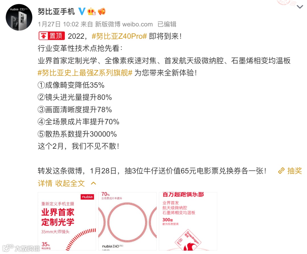 据官方预热,努比亚史上最强Z系列旗舰努比亚Z40 Pro将于2月份发布,业界首家定制光学、全像素疾速对焦、首发航天级微纳腔、石墨烯相变均温板,成像畸变降低35%,镜头进光量提升80%,画面清晰度提升78%,全场景成片率提升70%,散热系数提升30000%。