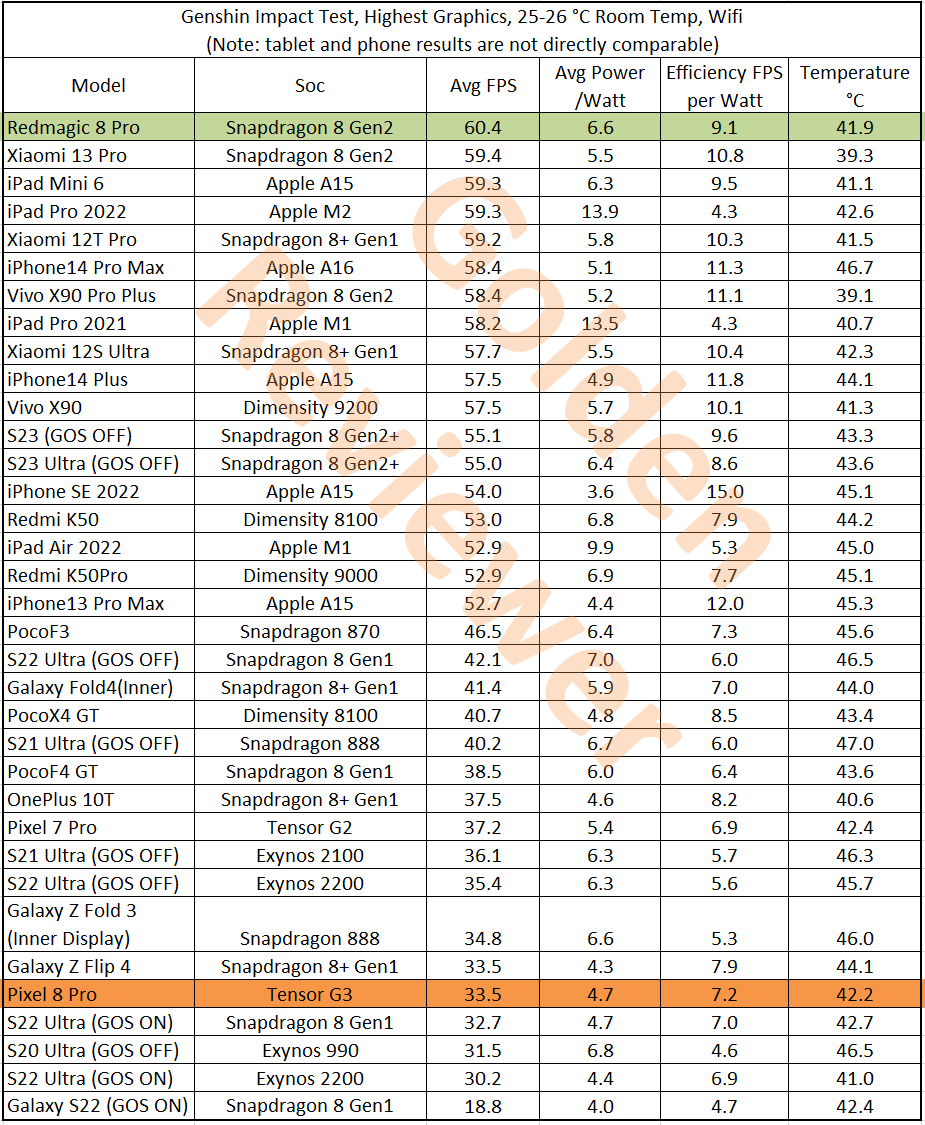 有海外媒体测试了谷歌Pixel 8系列的实际表现,Geekbench 6单核成绩1563-1760,多核跑分4169-4442,《原神》平均帧率低于骁龙888和骁龙8+,还不如上代Tensor G2的表现。这个成绩也怪不得谷歌禁止用户测试了。