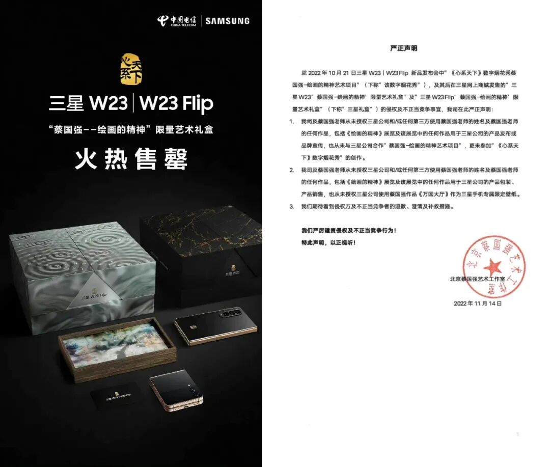 今天蔡国强工作室微信公众号发布声明称:「从未授权三星公司和/或任何第三方使用相关作品,从未与三星公司合作“蔡国强——绘画的精神艺术项目”,更未参加“《心系天下》数字烟花秀”的创作,希望看到侵权方及不正当竞争者的道歉、澄清及补救措施。」