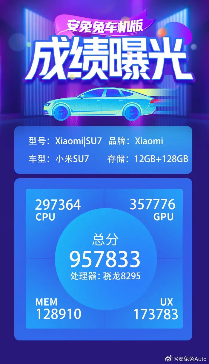 安兔兔公布的成绩显示,小米SU7搭载高通骁龙8295车规级智能座舱芯片,搭配16GB(实际分配到Android系统12GB)内存以及128GB存储,最终上传到安兔兔车机版后台的跑分成绩为957833,达到了骁龙8295的主流水准。