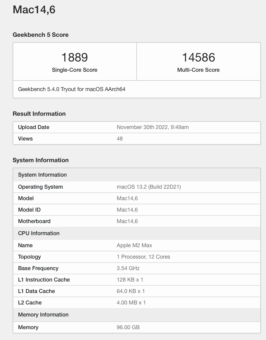 据Geekbench跑分库后台显示,苹果有一款型号为Mac14,6的电脑现身,搭载全新M2 Max芯片,12核心CPU,主频最高3.54GHz,配备96GB内存,Geekbench 5单核1889分,多核14586分。