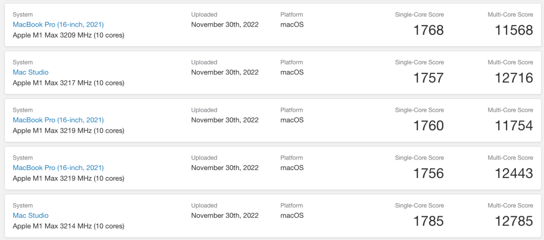 作为参考,苹果M1 Max为10核心CPU,单核跑分1700左右,多核跑分最高能接近12800。后续搭载M2 Max的新款电脑发布后,再看看实测性能表现如何。