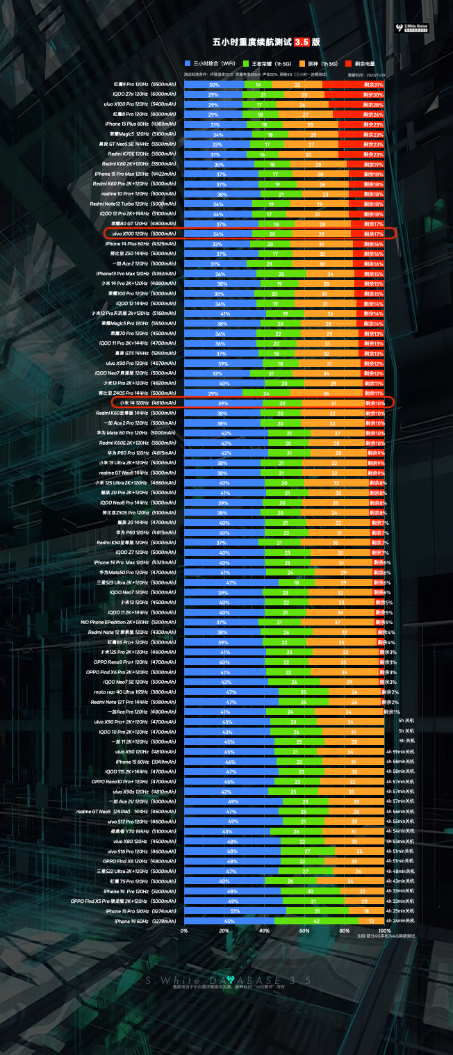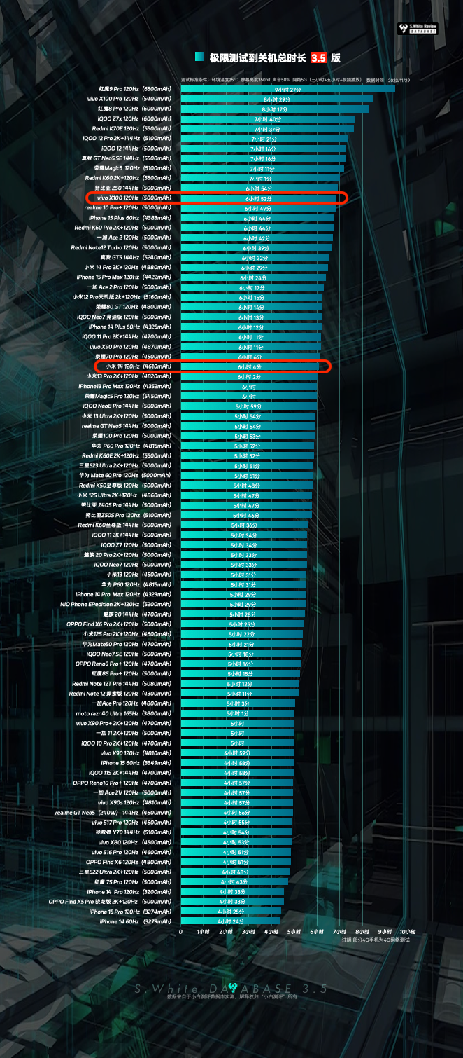 小白测评数据库小米14、vivo X100新系统版本续航成绩更新: