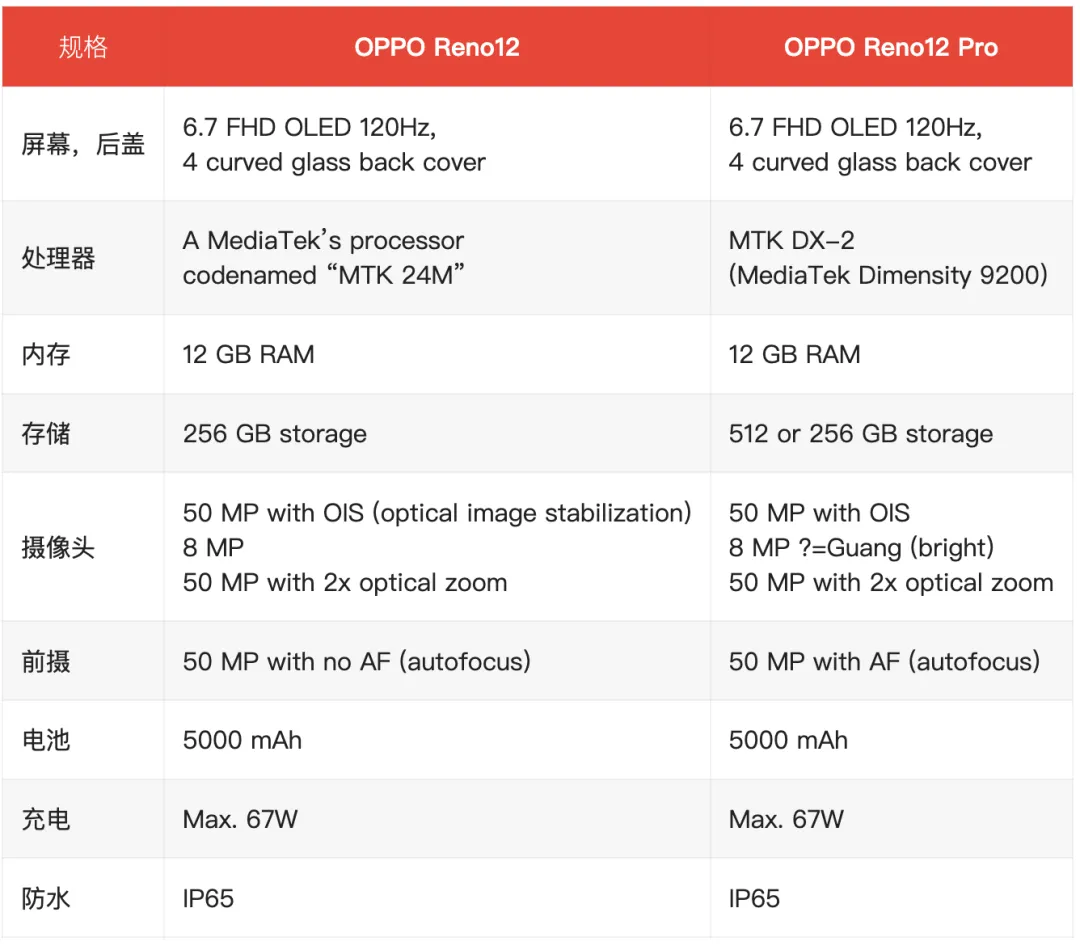 配置方面,早前外媒mspoweruser曾爆料,OPPO Reno12系列分为Reno 12和Reno12 Pro两款,均采用6.7英寸显示屏,外观和Reno11系列相似。数码闲聊站另外爆料称这两款新机将分别首发搭载「联发科天玑8250」和「天玑9200+星速版」。