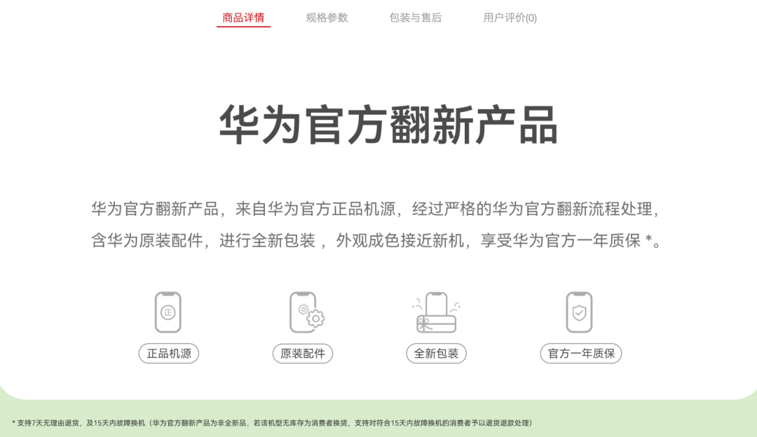 据官网介绍,华为官方翻新机是官方正品机源,经过严格的华为官方翻新流程处理,含华为原装配件,进行全新包装,外观成色接近新机,享受官方一年质保(支持7天无理由退货、15天内故障换机)。