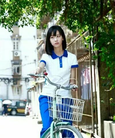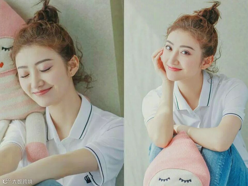 景甜写真身穿白色POLO衫水洗牛仔裤,头顶半丸子头显得俏皮可爱,少女气息扑面而来。