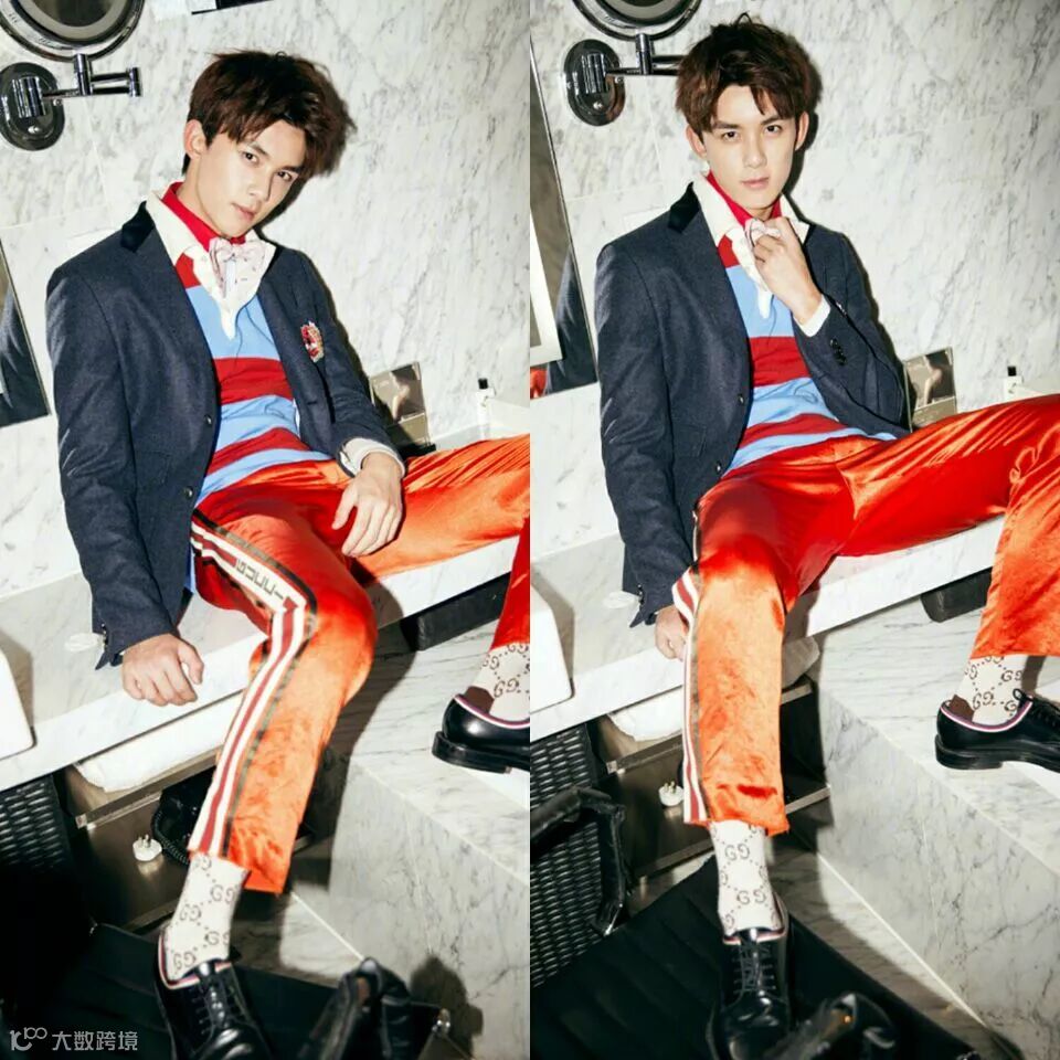吴磊西服搭配红蓝条纹polo衫,与红色裤子的亮色呼应十足,青春亮眼,将多元素完美hold住。