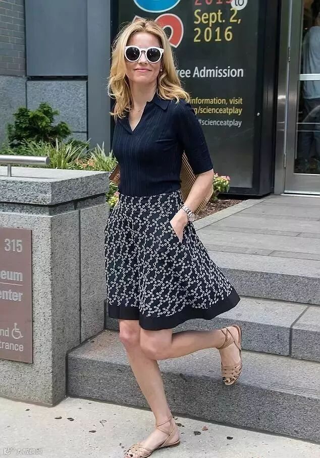Elizabeth Banks在费城出街,针织POLO上衣配A字半身裙,优雅轻松凹出来。