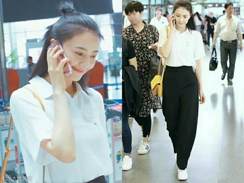 高圆圆机场照,POLO衫菊花刺绣,配上丸子头,减龄的标配!