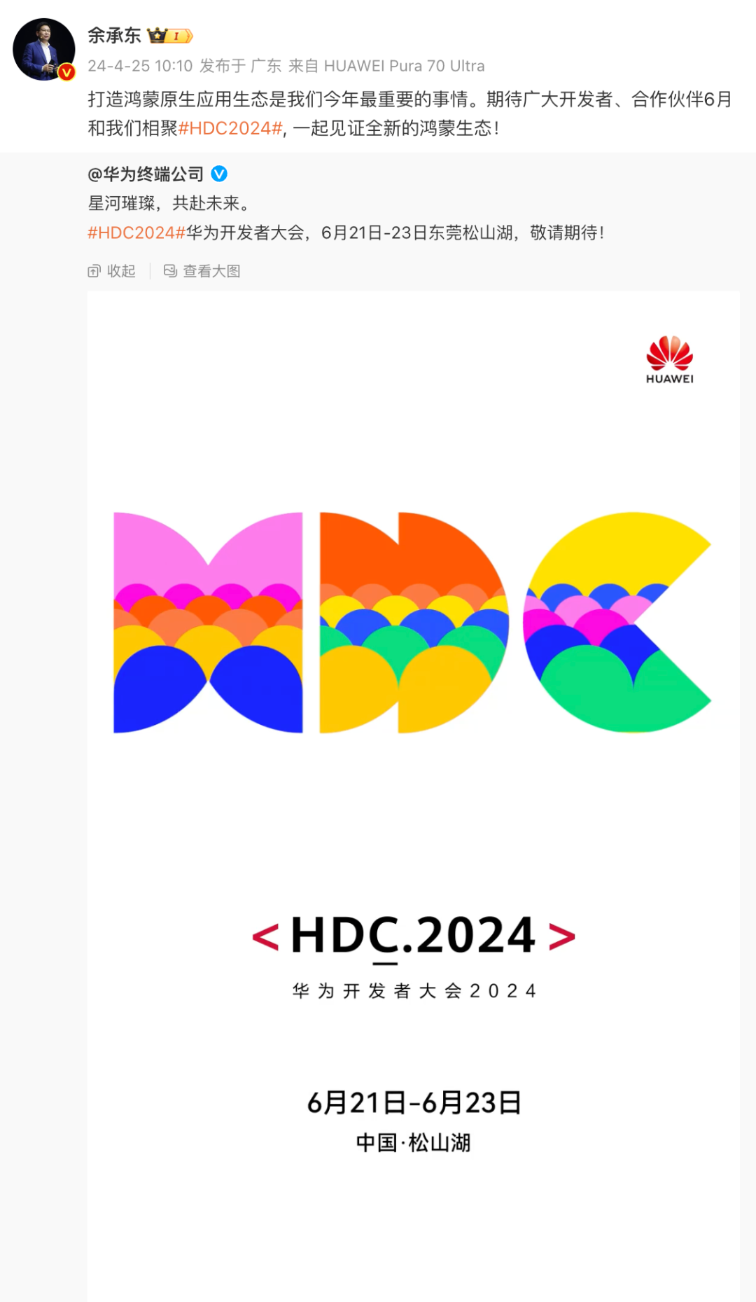 如上图所见,华为开发者大会2024将于6月21日-23日在东莞松山湖举行。