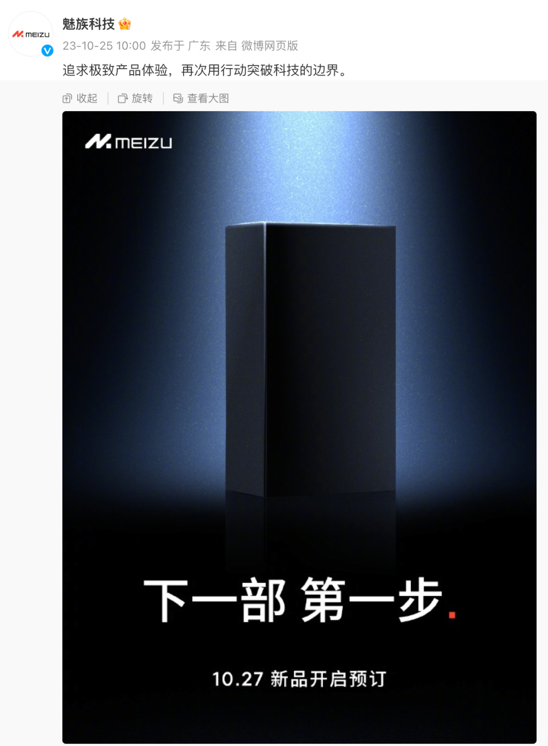 魅族预热新品将于10月27日开启预订,海报中暂时看不清产品是什么,由于这个时间点刚好是各家新旗舰预热,所以也被猜测是否是魅族21系列预热的预热,但也有猜想称可能是魅族M3 Pro Hi-Fi播放器。