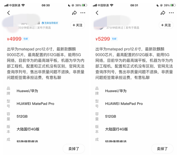 如上图所见,有网友发现闲鱼近期有一批MatePad Pro 12.6的120Hz屏幕版工程机,售价4999-5299元左右,搭载麒麟9000,各种基础配置和之前在售版本基本一致,不同的是由于工程机原因官网查询不到序列号。