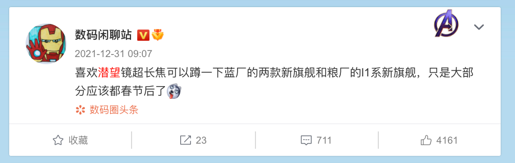 据爆料达人透露,喜欢潜望超长焦的用户可以蹲一下vivo家的两款新旗舰和小米的I1系新旗舰(I1是手机型号中的两位,因此这款指的应该是小米12 Ultra),并表示大部分应该都是春节后发布了。