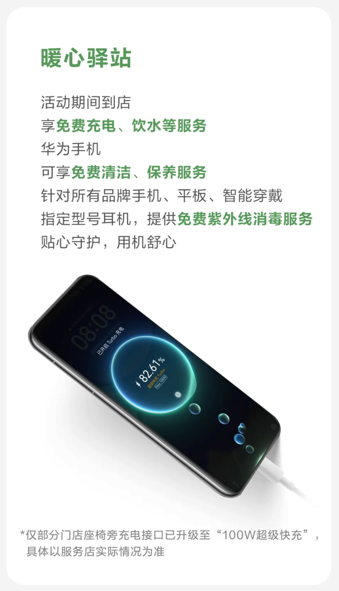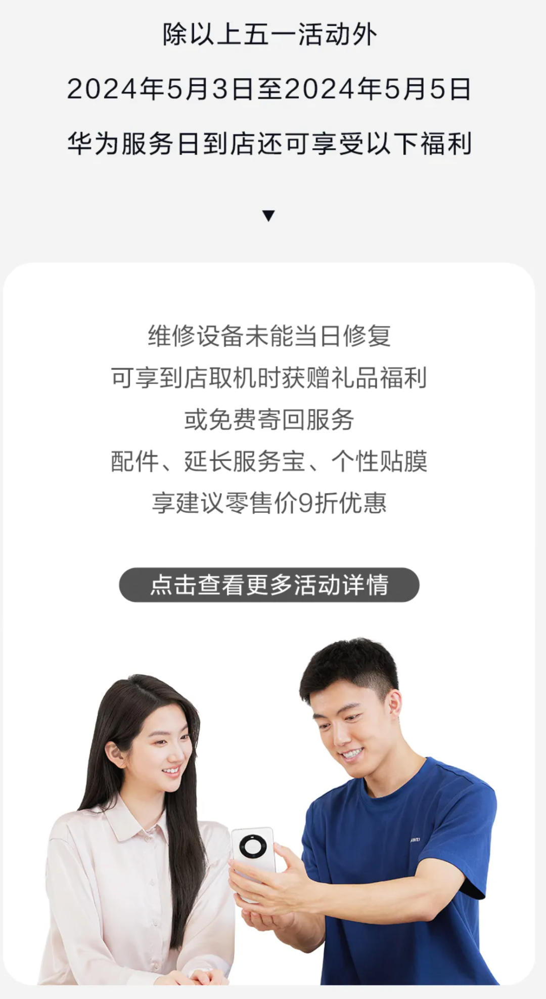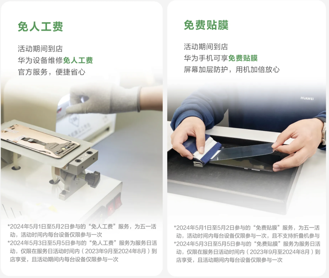 据介绍,2024年5月1日-5月5日,华为服务店带来多项活动:①免人工费:活动期间到店,华为设备维修免人工费;②免费贴膜:活动期间到店,华为手机可享免费贴膜;③暖心驿站:活动期间到店,享免费充电、饮水等服务,华为手机可享免费清洁、保养服务。针对所有品牌手机、平板、智能穿戴指定型号耳机,提供免费紫外线消毒服务。