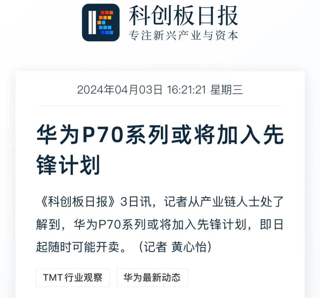至于发布日期,据科创板日报报道,从产业链人士了解到华为P70系列或将加入先锋计划,即日起可能随时开卖。网传可能是4月8日。
